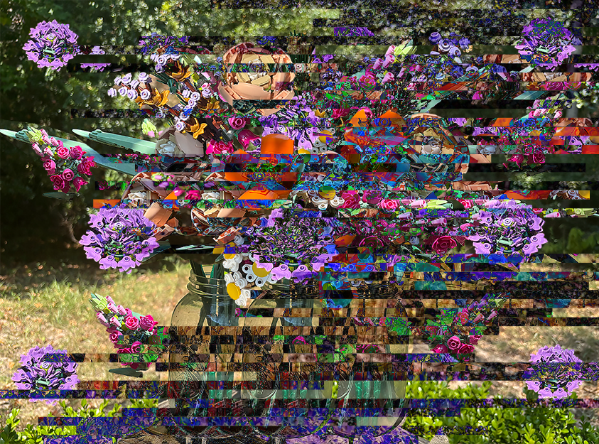 For this piece, I took my first image from the "Bad Photoshop" and ran it through a glitch generator, producing the image you see now! I already experiemented with distortion while creating the original image. I did this by copying and pasting components from the lego bouquet to create a larger bouquet. After doing this, I copied and pasted the bouquet on top of itself 2 times, and had them to the left and right of the center bouquet. Then, I put lego flowers in the background of the image to create balance. I like that the added distortion brings an entirely different viewing context for the piece.